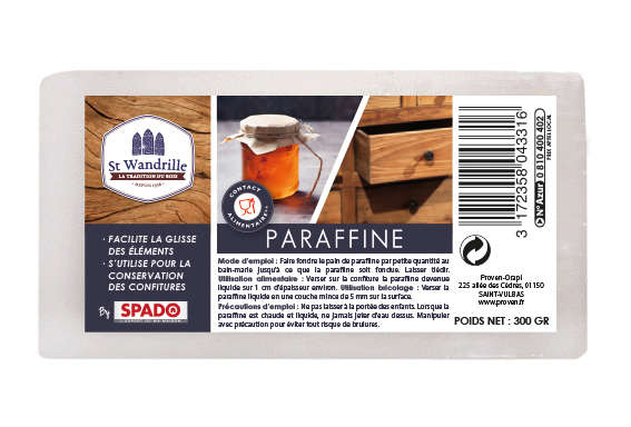 ST WANDRILLE PARAFFINE 300G Facilite la glisse des éléments pour le bricolage (tiroirs, etc.). | S’utilise pour la conservation des confitures. | État physique: solide. | Couleur: blanche