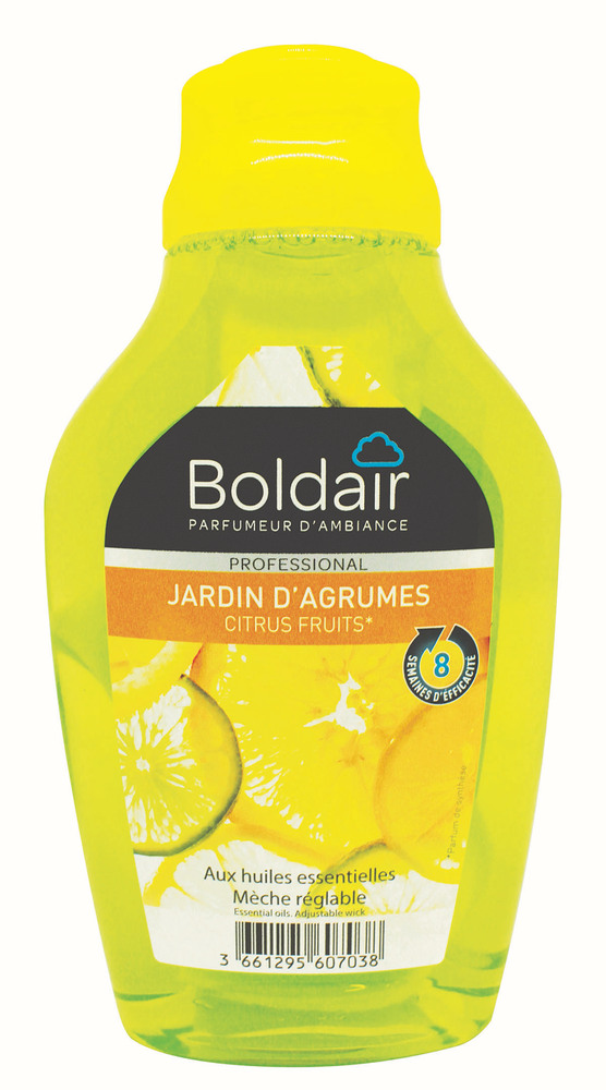 BOLDAIR MECHE JARDIN D’AGRUM 375ML Boldair mèche longue durée est un désodorisant permanent conçu pour les professionnels. | Le parfum jardin d’agrume a été sélectionné pour sa rémanence afin de créer une agréable atmosphère. | Parfume agréablement. | Efficacité longue durée : jusquà 8 semaines. Très économique. | Mèche réglable permettant de choisir lintensité de la neutralisation.