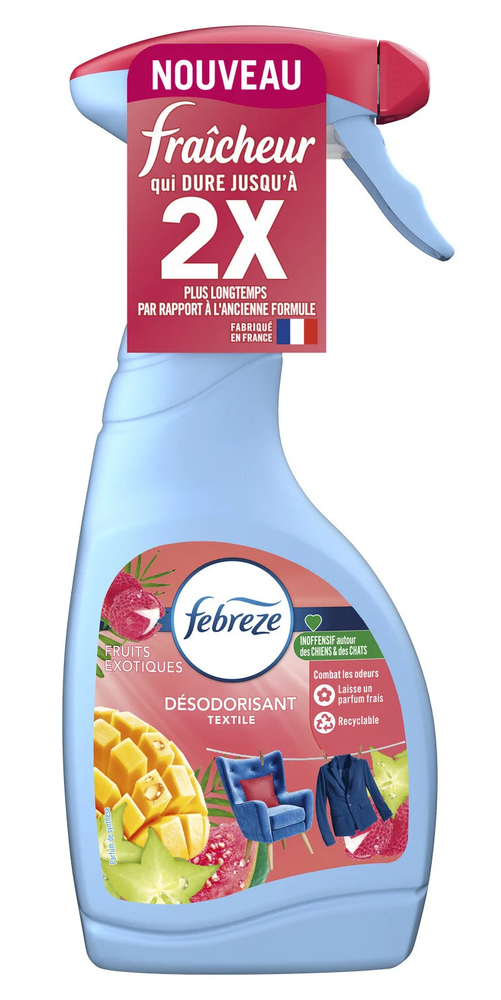 FEBREZE SPRAY FRUITS EXOT. 500ML Le spray désodorisant textile Febreze Fruits Exotiques combat les odeurs emprisonnées dans les textiles et laisse un parfum frais. Formulé à base d’eau, il est testé dermatologiquement et peut être utilisé en toute sécurité autour des chats et des chiens. Laisse un parfum frais de fruits exotiques.