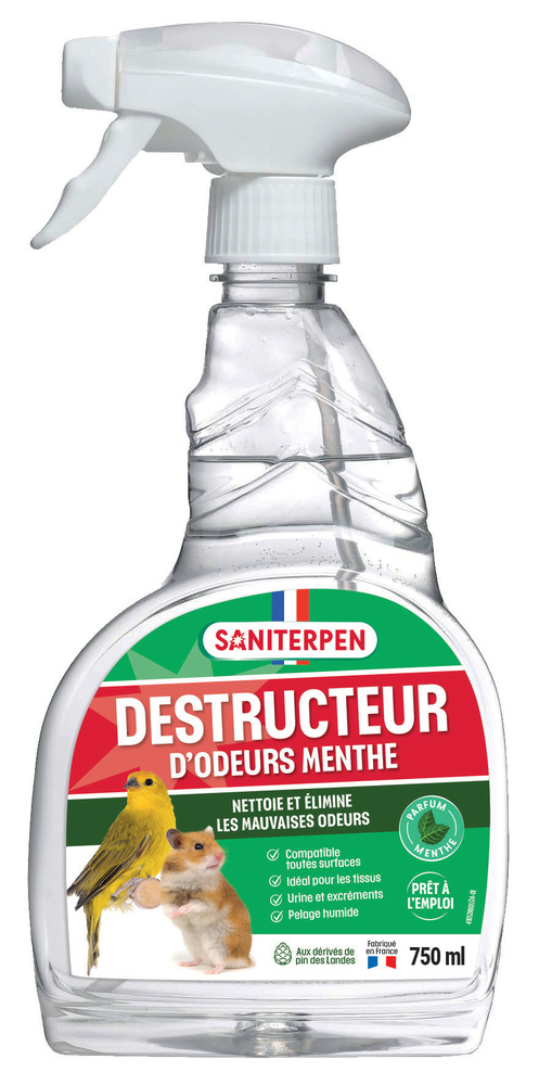 SANITERPEN DESTRU ODEURS MEN 750ML Élimine efficacement les mauvaises odeurs à la source grâce à une formule biotechnologique avancée. | Idéal pour les espaces intérieurs, notamment les habitats des animaux et les salons de toilettage. | Le parfum de menthe revitalisant laisse une atmosphère fraîche et agréable, parfaite pour les environnements nécessitant une hygiène optimale. | Cette solution assure une action durable, maintenant la fraîcheur de l’air ambiant tout en respectant l’environnement. | Destructeur d’Odeurs Menthe est conçu pour offrir une efficacité maximale avec une utilisation simple et pratique. | Elimine les odeurs d’urine, déjections, marquage du territoire, pelage humide. Compatible toutes surfaces, y compris les tissus