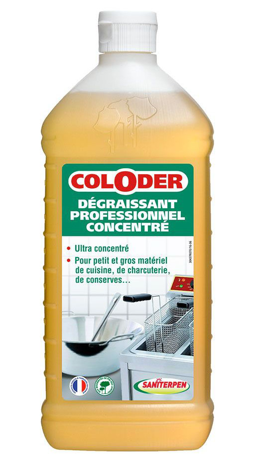 SANITERPEN COLODER DEGR PRO CONC 1L Nettoie et dégraisse efficacement le petit et gros matériel de cuisine. | Idéal après la préparation de charcuterie, conserves ou plats cuisinés, il élimine les graisses cuites et les traces de gras sur inox, carrelage, aluminium ou stratifiés. | Sa formule concentrée s’adapte à tous les besoins : cocottes, friteuses, plans de travail, sols et équipements variés. | Soluble dans l’eau, il garantit une propreté irréprochable et respecte l’environnement grâce à ses tensioactifs biodégradables.