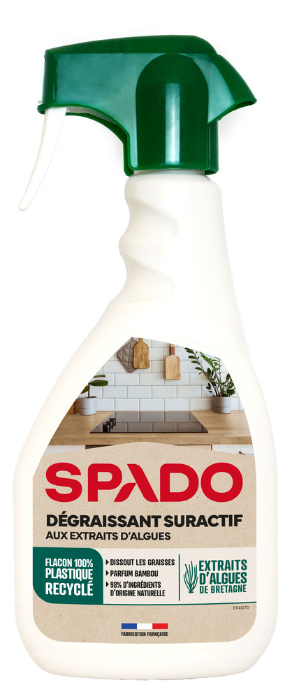 SPADO DEGRAISSANT AUX ALGUES 500ML Le Dégraissant Suractif Aux Extraits d’Algues offre une solution de nettoyage avancée avec les caractéristiques suivantes : | | – Profondément nettoyant, il dissout les graisses, même les plus tenaces et incrustées. | – Efficace sur tous les supports encrassés tels que le four, le micro-onde, la poubelle, le plan de travail, la hotte, la porte de réfrigérateur, etc. | – Laisse une agréable senteur de bambou fraîche. | – Conçu pour être en contact avec les aliments* en toute sécurité. | – Formulé à partir de 98% d’ingrédients d’origine naturelle. | – Enrichi en algues brunes provenant de sources biosourcées à Landerneau, en Bretagne. | – Combat efficacement les odeurs indésirables. | – Prêt à l’emploi sous forme de gel : il se pulvérise sans coulure et adhère parfaitement aux surfaces. | – pH neutre de 8. | – L’emballage est entièrement recyclable et le flacon est fabriqué à partir de plastique recyclé à 100%.
