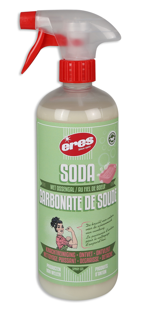 CARBONATE DE SOUDE SPRAY 750ML Eres CARBONATE DE SOUDE est un nettoyant et dégraissant puissant conçu pour toutes les surfaces lavables et les appareils électroménagers, que ce soit dans la cuisine, la salle de bain ou sur d’autres surfaces de la maison et ses alentours. | Il est également un allié efficace pour le soin du linge, agissant comme un traitement de prélavage redoutable contre les taches tenaces. | | Nettoyage et dégraissage : convient parfaitement pour le four, les plans de travail, les éviers, hottes, casseroles, poêles, réfrigérateurs, lave-vaisselles, douches (et rideaux), baignoires, robinets, émail, inox, carrelages, surfaces en pierre naturelle, barbecues et meubles de jardin. | Détachage : idéal pour traiter les textiles, les meubles en tissu, les tapis ainsi que le linge blanc ou coloré.