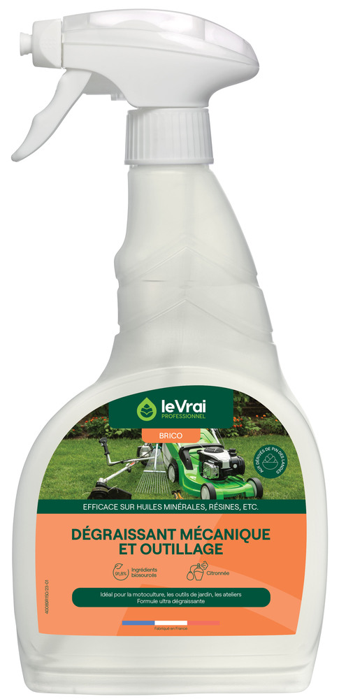 LE VRAI PRO DEGRAIS MECA&OUTI 750ML Formule ultra dégraissante, prête à lemploi, idéale pour dégraisser les surfaces encrassées. | Idéal pour la motoculture, les outils de jardin, les ateliers. | Efficace sur huiles minérales, résines, résidus de colle et dadhésifs, etc. | | ▪, Dégraisse surfaces dateliers, moteurs, pièces mécaniques, outils de motoculture, de jardin, etc. | ▪, Élimine les taches tenaces