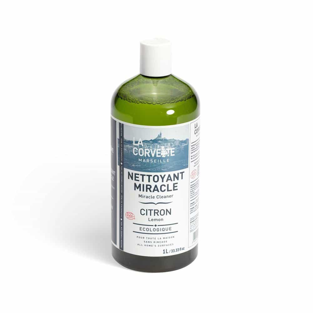 NETTOYANT MIRACLE CITRON 1 Nettoyant multi-surfaces pour toutes les pièces de la maison, efficace sans rinçage. | Sa formule fluide est adaptée à lentretien quotidien des surfaces lavables. | Parfumé au citron, il laisse une sensation de fraîcheur agréable après chaque utilisation. | Composé à 99,5% dingrédients dorigine naturelle, il est certifié ECOCERT. | Son flacon 1L en plastique recyclé sinscrit dans une démarche écoresponsable. | Utilisable en toute sécurité dans un cadre domestique exigeant, sans danger connu pour lenvironnement.