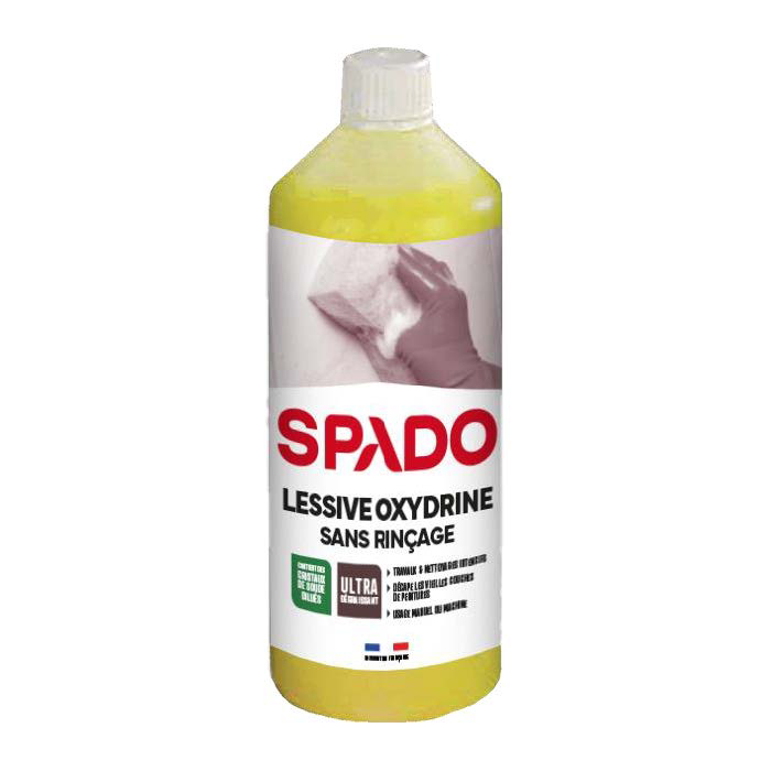 SPADO OXYDRINE LESS GROS TRAVAUX 1L La lessive oxydrine sans rinçage gros travaux et nettoyages intensifs, nettoie, décape et dégraisse toutes les surfaces sans les altérer : peintures, moquette, carrelage, plancher, linos, tapis, surfaces métalliques, carrosserie, aluminium, acier, plastique, toile de verre, marbre, etc. | Elle convient pour surfaces intérieures ou extérieures sols, murs, mobilier de jardin, hotte, cuisinière, garage. | | Elle élimine les salissures tenaces graisses incrustées peinture écaillées ou anciennes, cendres, | colle, chewing-gum, rouille, cire, suie. | | Sa formule est sans solvant chimique, sans silicone 85% des ingrédients dorigine naturelle dont les cristaux de soude pour une efficacité renforcée. | Sans phosphate, sans conservateur. | | Sutilise à la main ou en machine. | Rendement moyen 10 à 30 m² par litre de produit concentré selon nature des travaux.