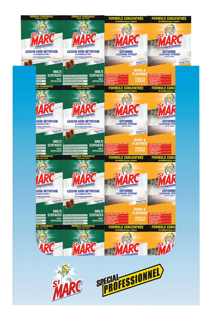 ST MARC BOX X112 MIXTE OXYD+LESSIVE Box mixte composée de 56 boites de Lessive St Marc au savon de Résine de Pin de 1kg, et de 56 boites de lessive St Marc Professionnel Oxydrine lessivage intensif de 1kg. | | La lessive St Marc est un produit dentretien sans abrasif, idéal pour le nettoyage de toute la maison, des surfaces les plus délicates aux tâches les plus difficiles. | Elle se dissout instantanément, même dans leau froide, sans produire de mousse. | Sans phosphate et sans colorant. | Nouvelle formule, deux fois plus concentrée (1kg = 2kg de produit classique). | | La nouvelle formule de la lessive St Marc Professionnel Oxydrine est deux fois plus concentrée, répondant parfaitement aux exigences des professionnels du bâtiment pour les lessivages intensifs et les gros travaux domestiques. | Se dissout instantanément, même dans leau froide, et se rince facilement grâce à sa composition non moussante. | Efficace pour nettoyer et décaper les anciennes couches de peinture, elle rénove les surfaces sans les altérer.