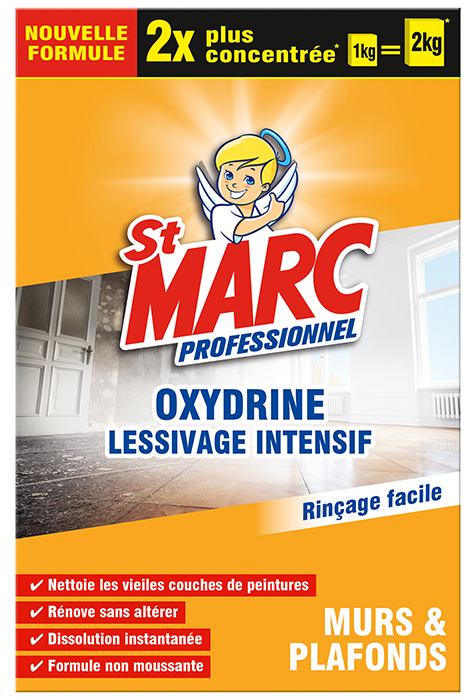 ST MARC OXYDRINE PRO 1KG La nouvelle formule de la lessive St Marc Professionnel Oxydrine est 2x plus concentrée. | Elle est adaptée aux besoins spécifiques des professionnels du bâtiment pour le lessivage intensif et pour tous les gros travaux de la maison. | Cette lessive se dissout instantanément même dans l’eau froide, puis elle se rince facilement grâce à sa poudre non moussante. | Elle nettoie et décape les vieilles couches de peintures, elle rénove sans altérer les surfaces.