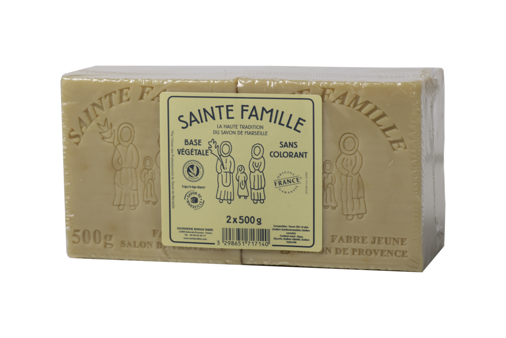 SAVON MARSEILLE 2X500G ST FAMILLE Pour le lavage du linge, peut être également utilisé pour la toilette du visage et du corps. | Huiles 100 % végétales (Huile de tournesol oléique, huile de coprah). | Sans colorant, sans parfum, sans conservateur. | Sans additif chimique et sans huile de palme.