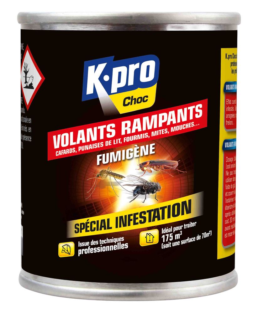 K-PRO CHOC FUMIGENE VOL&RAM 150M³ Ce fumigène éradique facilement les infestations d’insectes volants et rampants dans les locaux professionnels. | Sa formulation à base de cyphénothrine agit de manière radicale contre un large spectre d’insectes : blattes, cafards, fourmis, punaises, puces, mouches, moustiques, mites, araignées, etc. | Il diffuse une fumée insecticide qui pénètre dans les moindres interstices, garantissant une couverture complète même dans les zones difficilement accessibles. | Le produit traite efficacement un volume de 175 m³, soit environ 70 m², avec une action immédiate et curative. | Il est issu des techniques professionnelles et convient à une application ponctuelle en intérieur. | Son usage est réservé aux espaces bien ventilés, en l’absence de personnes, animaux ou denrées non emballées.