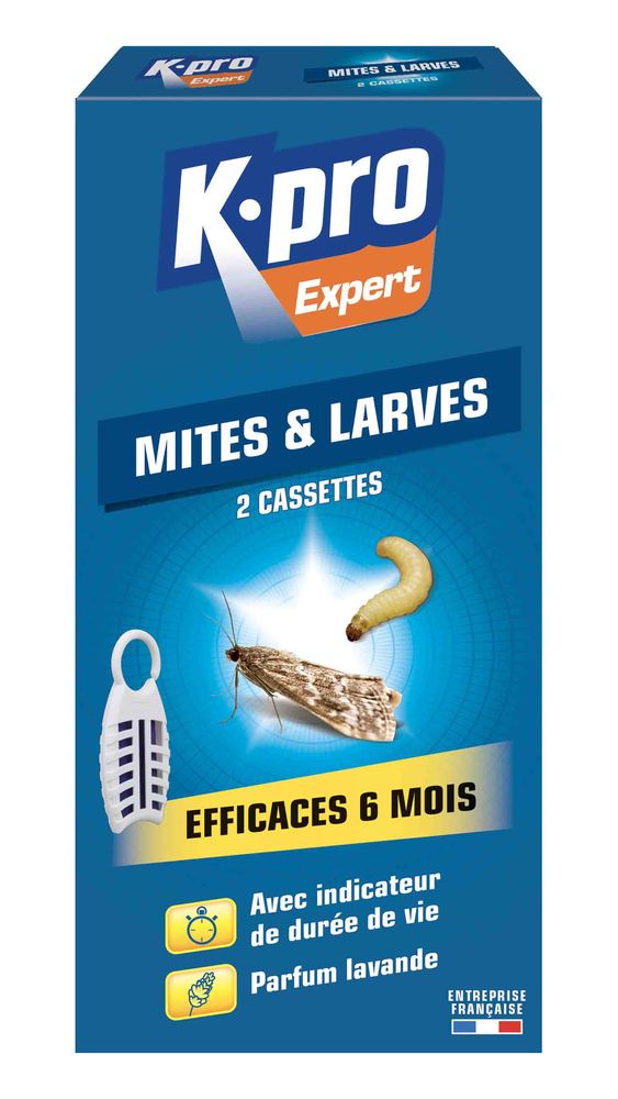 K-PRO EX 2K7 MITES&LARVES VETEMENTS Ces cassettes anti-mites luttent efficacement contre les mites textiles et leurs larves. | Leur diffusion continue assure une protection prolongée dans les penderies, armoires ou placards. | Grâce à leur boîtier protecteur, elles s’utilisent sans contact direct avec les vêtements, sans risque de tache. | Chaque cassette contient un crochet de suspension et un indicateur visuel de durée de vie. | Le parfum lavande contribue à une ambiance fraîche tout en éloignant les nuisibles. | Un étui contient deux cassettes, chacune couvrant jusqu’à 3 m³ pendant six mois.