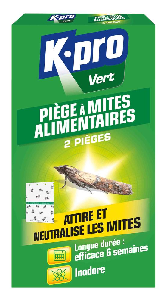 K-PRO VERT 2PIEGES MITES ALIMENT Piège sans problème les mites alimentaires présentes dans les zones de stockage. | Il attire les mâles grâce à une phéromone spécifique, empêchant ainsi la reproduction et réduisant les infestations. | La surface encollée emprisonne les insectes dès leur contact avec le piège. | Le système est inodore et fonctionne sans insecticide, convenant aux environnements sensibles. | Chaque piège reste actif jusquà six semaines, avec une efficacité optimisée dans les placards ou réserves alimentaires. | Une bande adhésive permet une fixation simple à lintérieur des meubles de cuisine ou zones de stockage fermées.