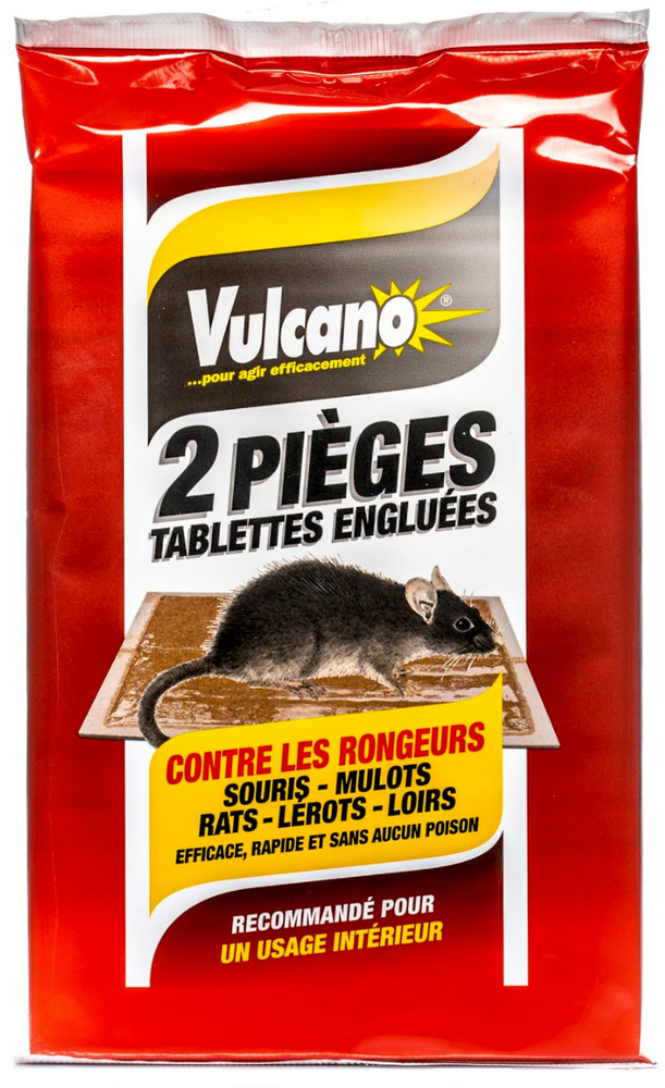 VULCANO 2 PIEGES A GLU RATS SOURIS Ces pièges englués sont des tablettes collantes jetables et prêtes à l’emploi, conçues pour la capture des rongeurs : rats, souris, mulots, lérots et loirs. | Ces plaques collantes, non toxiques et sans poison, s’utilisent en intérieur, avec ou sans appât. | Dépose rapide sur les lieux de passage des rongeurs, le long des murs ou près des meubles. | La colle garantit une efficacité de 3 à 6 semaines, même en milieu humide. | Simples à utiliser, ces pièges permettent d’immobiliser les nuisibles pour une élimination ultérieure. | Conditionnement : lot de 2 plaques de 28 cm x 19 cm.