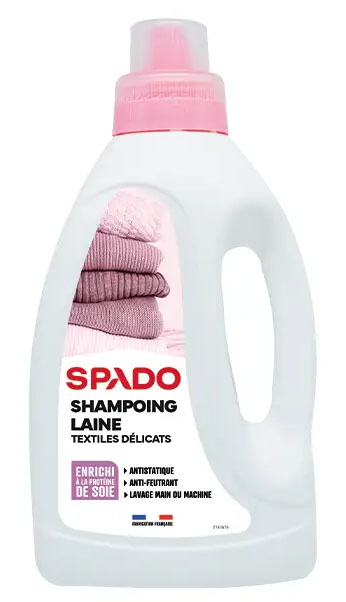 SPADO SHAMPOOING LAINE 750ML Shampooing spécialement conçu pour le lavage à la main ou en machine de la laine et des textiles délicats, tels que l’élasthanne, les fibres synthétiques, la laine, le cachemire, la soie, les fibres mélangées, les dentelles et les collants. | Sa formule, enrichie en protéines de soie et dotée d’un agent anti-feutrant, pénètre en profondeur les fibres pour conserver la douceur du linge et préserver l’éclat du neuf. | Il offre également un effet antistatique, prévenant ainsi l’électricité statique sur les vêtements et textiles. | Ce produit est idéal pour prendre soin des tissus fragiles, garantissant un lavage doux et efficace.