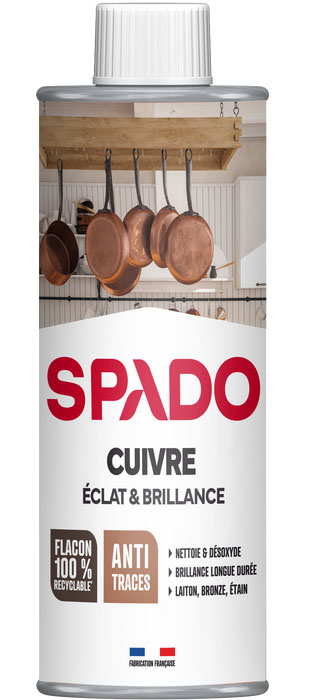 NETTOY.SPEC.CUIVR. FLACON 250ML Conçu pour nettoyer et désoxyder efficacement les objets en cuivre, tels que les casseroles, poignées et tringles, leur redonnant ainsi tout leur éclat. | Ce nettoyant pour cuivre offre une brillance durable et est adapté au contact alimentaire, ce qui le rend idéal pour les ustensiles de cuisine. | Avec 86% d’ingrédients biodégradables, ce produit est respectueux de l’environnement. | Sa formule agit en profondeur pour éliminer les ternissures et les traces d’oxydation, tout en étant facile à utiliser et à rincer. | Il est recommandé de ne pas l’utiliser sur des métaux vernis ou laqués pour éviter d’endommager la surface.