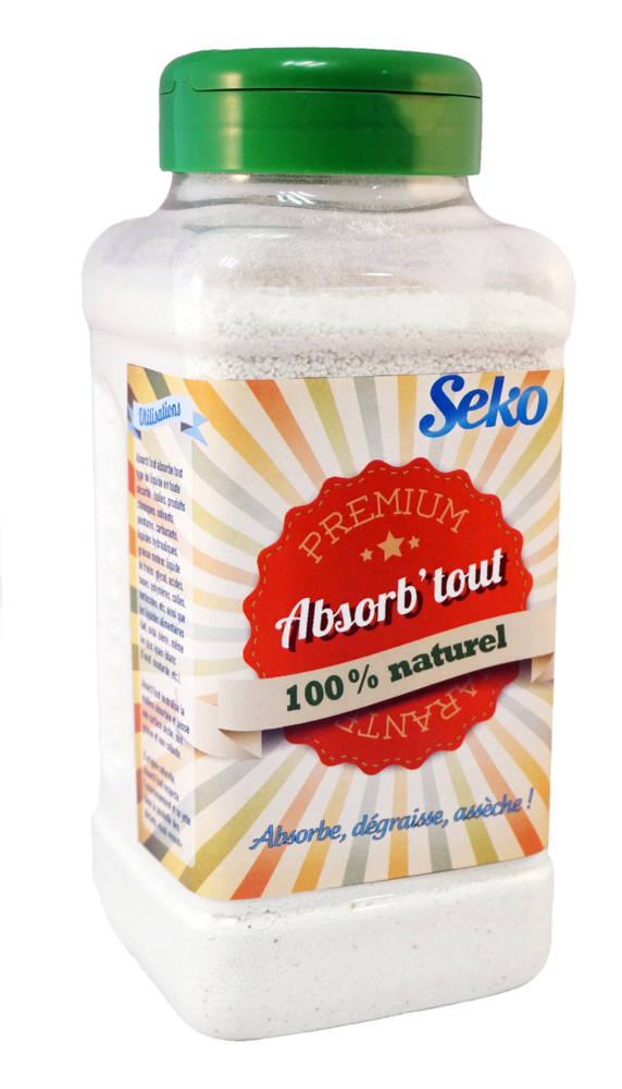 SEKO POUDRE ABSORB 100%NAT 1L Poudre écologique et ultra absorbante en sachet. | Absorbe tous les liquides et corps gras. | Action 3 en 1 : dégraisse, nettoie et assèche.