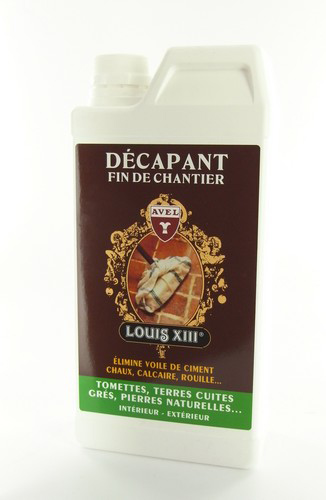 LOUIS XIII DECAPANT FIN DE CHANTIER Sans acide chlorydrique, recommandé pour enlever les voiles de ciment, chaux, plâtre, calcaire, salpêtre, rouille, tomettes, terres cuites, grès, pierres naturelles.