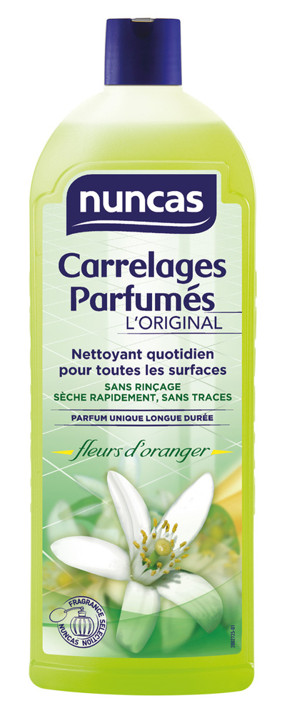 CARRELAGES PARF. FLEURS D’ORANGER1L Nettoyant et détergent universel adapté à tous les types de sols et aux surfaces lavables de la maison (y compris le marbre et le parquet). Son pH neutre respecte aussi toutes les surfaces les plus délicates, en nettoyant sans enlever la cire éventuelle. Grâce à son fort pouvoir détergent (il est quatre fois plus concentré que la plupart des produits dans le commerce), il nettoie à fond en désinfectant car il contient de lalcool. En un seul passage, il garantit un résultat parfait, sans auréoles. | Il laisse un agréable parfum de Fleurs d’Oranger qui persiste longtemps dans les pièces. | | Grâce à son action assainissant qui nettoie à fond sans laisser de traces, ce nettoyant Nuncas redonne à votre intérieur toute sa luminosité et sa beauté d’origine ainsi qu’une touche personnelle qui rend l’atmosphère chaleureuse et parfumée.