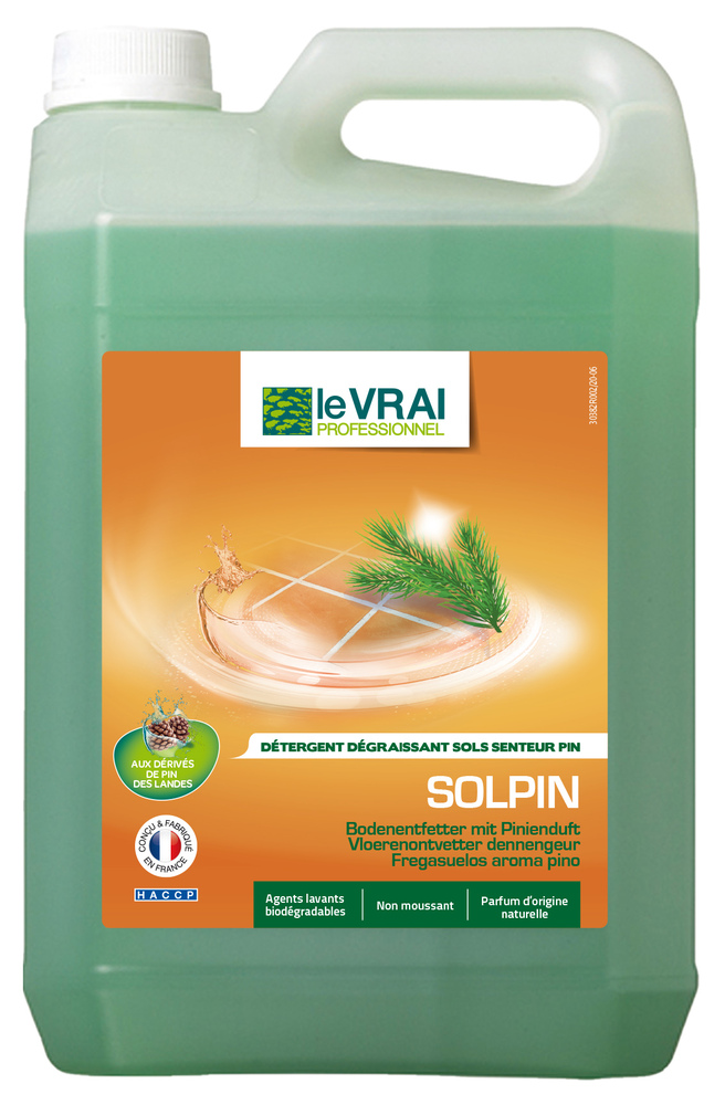 LE VRAI PRO SOLPIN 5L Le nettoyant concentré SOLPIN Le Vrai Pro nettoie, dégraisse et odorise sans mousser, tous types de locaux… | Il est utilisé par les entreprises de propreté, personnels d’entretien, services généraux, syndics, secteur médical, cafés, hôtels, restaurants… | Respectueux de l’environnement par sa composition, il permet de lier efficacité et démarche écologique. | Il laisse une odeur agréable et fraîche. | Apte au contact alimentaire après rinçage à l’eau potable. | Senteur Pin des Landes. | S’intègre dans une démarche HACCP. | Sans pictogramme de danger.