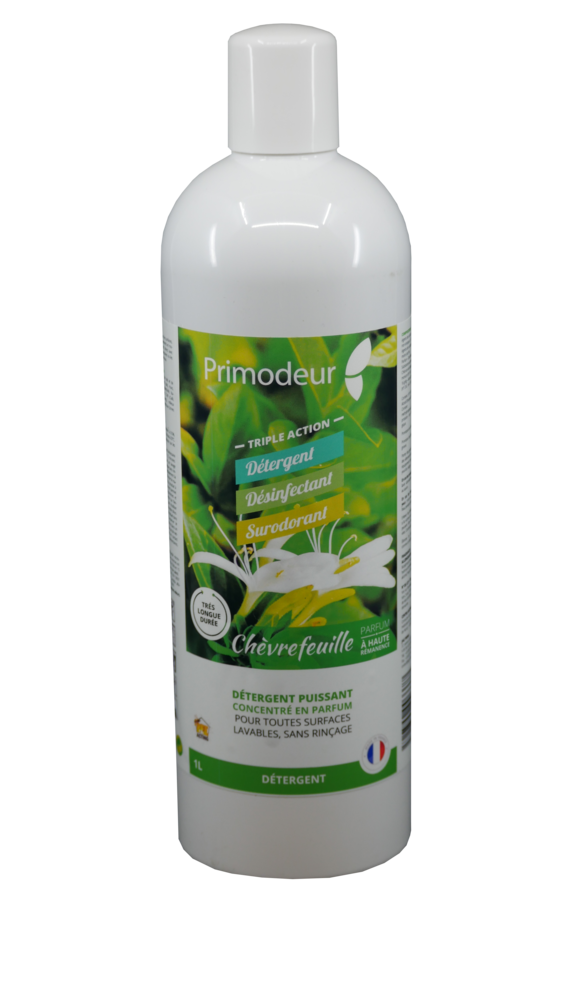PRIMODEUR 3D 1L CHEVREFEUILLE Détergent et désinfectant pour les surfaces, matériaux, équipements et mobiliers. Également efficace pour désinfecter les espaces publics tout en laissant une agréable odeur.