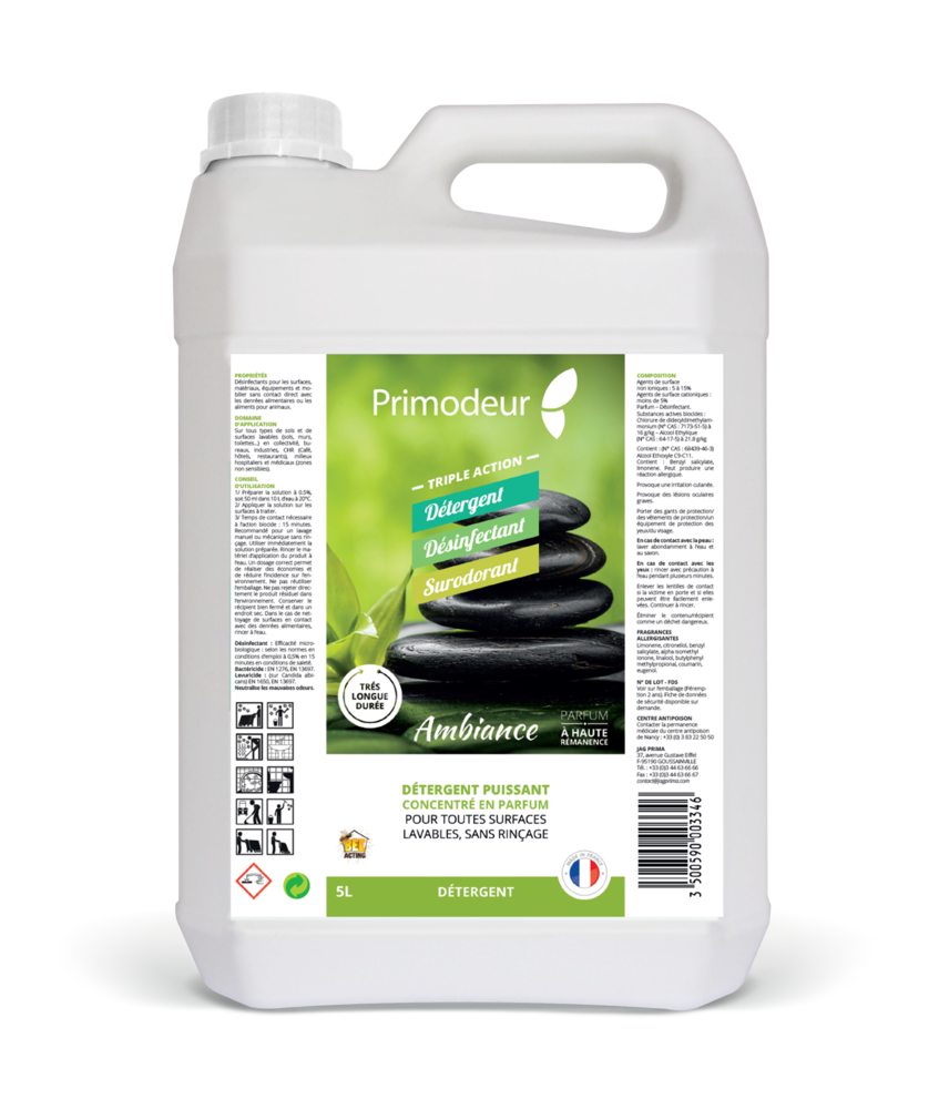 PRIMODEUR 3D 5L AMBIANCE Détergent et désinfectant pour les surfaces, matériaux, équipements et mobiliers. Également efficace pour désinfecter les espaces publics tout en laissant une agréable odeur.