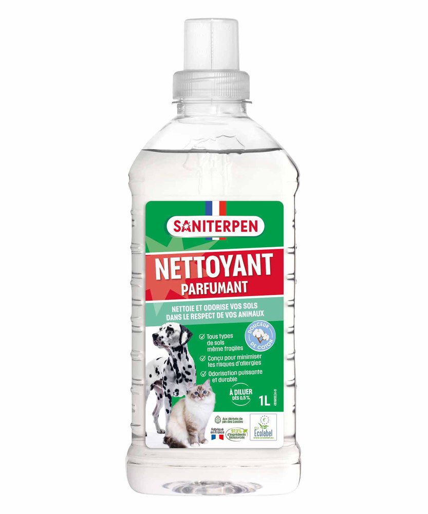 SANITERPEN NETT PARFUMANT ECO 1L Pour nettoyer tous types de sols, même fragiles, tout en parfumant avec une odeur délicate de coton. | Sa formule concentrée réduit les risques d’allergies et garantit une action désodorisante puissante et durable, idéale pour un intérieur respectueux des animaux. | Labellisé Ecolabel Européen, ce nettoyant parfumant est composé à 97,3 % d’ingrédients biosourcés et conditionné dans un flacon recyclable. | Convient à un usage domestique ou professionnel. | Sa dilution économique permet jusqu’à 100 lavages par litre. | Parfait pour une hygiène optimale au quotidien.