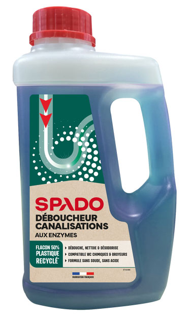SPADO DEBOUCHEUR BIOLOGIQUE 1L Ce déboucheur biologique dissout efficacement les matières organiques responsables des bouchons, comme la graisse, le savon et les déchets alimentaires. | Il élimine les mauvaises odeurs grâce à une formule sans acide et sans soude, agissant par l’action d’enzymes. | Compatible avec tous types de canalisations, il est sans danger pour les fosses septiques et les bacs à graisse. | Il n’attaque pas le plastique, les chromes, ni les métaux, et laisse un parfum frais après utilisation.