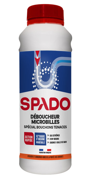 SPADO DEBOUCHEUR MICRO BILL 500G Microbilles de soude pour une action choc, spécial bouchon total. | Dissout graisses, savon, cheveux. | Stop les odeurs. | Toutes canalisations. | | Débouche lavabos, éviers, canalisations. | Dissout les matières organiques telles que graisses, cheveux, etc. | Nabîme ni tuyauterie, ni faïence, ni céramique.