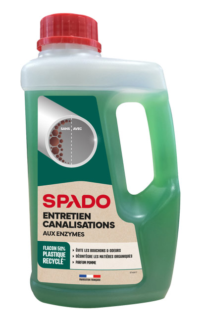 SPADO ENTRETIEN CANALISAT BIO 1L Pour un entretien efficace des canalisations, ce traitement biologique à base d’enzymes est idéal pour éliminer les dépôts et les mauvaises odeurs. | Il désintègre les matières organiques, évitant ainsi les bouchons et les remontées d’odeurs désagréables. | L’Entretien canalisations biologique Spado ne contient ni soude ni acide, garantissant une utilisation sûre et respectueuse de l’environnement. | | Grâce à son bouchon doseur, il est facile à utiliser et permet un dosage précis pour chaque application. | Ce traitement dégrade les résidus organiques tels que les cheveux et la graisse, tout en éliminant durablement les mauvaises odeurs à la source. | Il ne contient aucun germe pathogène, assurant une sécurité totale pour l’homme, la faune et la flore. | L’action désodorisante laisse une agréable sensation de fraîcheur et un parfum de pomme après utilisation.