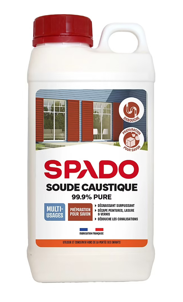 SPADO SOUDE CAUSTIQUE PURE 1KG Décape les supports peints, vernis ou lasurés. | La soude caustique pure dégraisse les surfaces encrassées et grasses. | Élimination multi couches. | Egalement utilisée pour déboucher les canalisations.