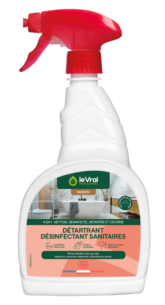 LE VRAI MAISON DET DESINF SANIT 750 Détartrant désinfectant sanitaires 4 en 1 : nettoie, désinfecte, détartre et odorise. Formule biotechnologique, prête à lemploi, idéale pour nettoyer, désinfecter, détartrer et odoriser les surfaces sanitaires. Élimine 99,99% des germes.
