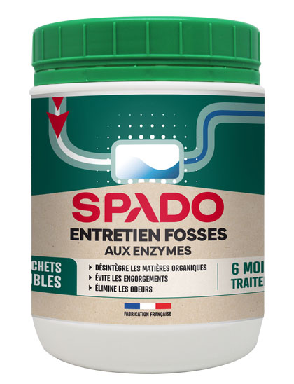 SPADO ENTRETIEN FOSSES X24 DOSES Pour un entretien efficace des fosses septiques, ce traitement bioenzymatique est conçu pour prévenir la formation de bouchons et réduire la fréquence des vidanges coûteuses. | Il se compose de doses hydrosolubles qui dégradent les matières grasses et organiques, assurant un fonctionnement optimal des fosses. | L’Entretien fosses aux enzymes utilise une formule biologique à base de bactéries et d’enzymes pour éviter l’accumulation de boues et les mauvaises odeurs. | Compatible avec les fosses septiques, fosses toutes eaux, bacs à graisse, ainsi que les matériaux en plastique, métaux et alliages, il respecte l’environnement. | | Chaque sachet pré-dosé est facile à utiliser : il suffit de le jeter dans la cuvette des WC et de tirer la chasse d’eau, sans manipulation supplémentaire. | Avec une puissance bactérienne élevée de 15 g par semaine, ce traitement assure un entretien continu sur 6 mois pour une fosse de 1000 litres. | 24 sachets de 15 g = 6 mois d’entretien.