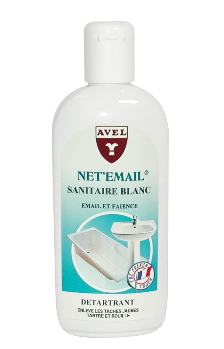 AVEL NET’EMAIL SANIT BLANCS 250 ML Net’Email Sanitaire Blanc est un produit spécialement conçu pour l’entretien des sanitaires en émail ou faïence de couleur blanche. | Il agit efficacement en tant que détartreur, éliminant non seulement les dépôts de tartre, mais aussi les taches jaunes et les traces de rouille, laissant ainsi vos sanitaires blancs propres et immaculés. | Ce produit est idéal pour une utilisation dans toutes les installations sanitaires blanches, que ce soit dans votre salle de bains, vos toilettes ou toute autre zone nécessitant un nettoyage en profondeur. | Grâce à Net’Email Sanitaire Blanc, vous pouvez préserver la beauté et la propreté de vos sanitaires en émail ou faïence blanche avec facilité et efficacité.