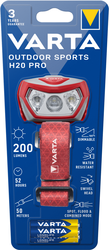 OUTDOOR SPORTS HEAD LED H20 3AAA Lampe frontale, accessoire de sport robuste et élégant. | 3 modes d’éclairage | LED rouge pour la vision nocturne, non éblouissante. | Portée du faisceau: jusquà 50 m | Autonomie: jusquà 52 h | Intensité lumineuse: jusquà 200 lumens | Technologie: 2x 3mm LED | Garantie 3ans
