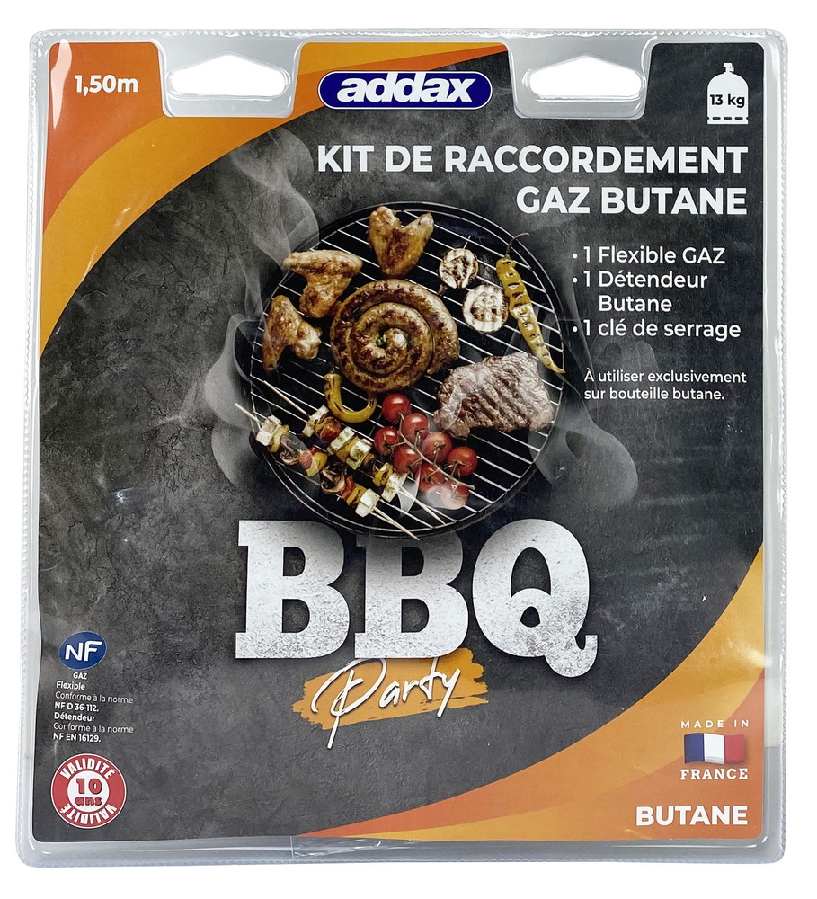 KIT PLANCHA BUTANE 1M50 + DET Ce kit est conçu pour assurer le raccordement sécurisé des barbecues et planchas fonctionnant au gaz butane. | Il comprend un détendeur à sécurité conforme aux normes en vigueur, garantissant une régulation stable de la pression de gaz. | Le flexible de 1,50 m, équipé d’embouts à visser, permet une installation simple et rapide sur différents modèles compatibles. | La clé multifonction intégrée facilite le serrage et le desserrage des raccords, tout en offrant un outil pratique pour retirer l’opercule de la bouteille. | Les composants du kit respectent les normes NF relatives à la sécurité et à la durée de vie des équipements gaz. | Cet ensemble complet est adapté à une utilisation en extérieur dans le cadre d’installations temporaires ou saisonnières.