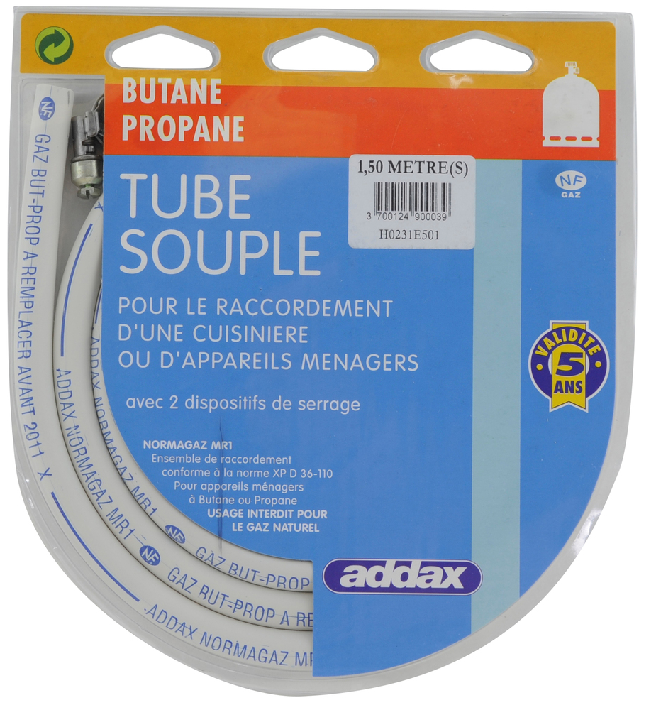 TUBE GAZ BUTANE PROPANE 1M5 6X12 Tuyau de gaz souple + 2 colliers de serrage auto cassants. | Thermoplastique. | Validité 5 ans | Norme : NF XP D36-110