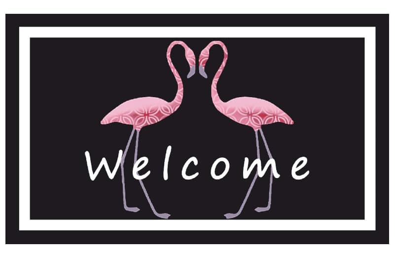 TAPIS VELVET D2613-2 FLAMINGO 45X75 Mise sur un visuel élégant et moderne, avec deux flamants roses symétriques encadrant l’inscription « Welcome ». | Le design de ce tapis imprimé sur fond noir contrasté s’intègre aussi bien dans un intérieur contemporain que dans un espace extérieur abrité. | La surface en velours polyamide offre une sensation douce sous les pieds, tout en retenant les particules fines. | Doté d’un dos latex antidérapant, il reste stable même sur les sols lisses ou carrelés. | Son impression numérique assure un rendu précis et durable des motifs. | Facile à entretenir, il se lave en machine à 30 °C, idéal pour un usage quotidien à l’entrée.