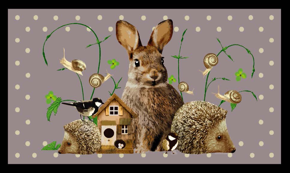 TAPIS VELVET LAPIN HERISSONS 45X75 Gamme Velvet | Aspect velours, tufting 1/10e. | 100 % PA. | Poids total : 1180g/m² | Hauteur de poils : 5mm | Hauteur totale : 6.5mm