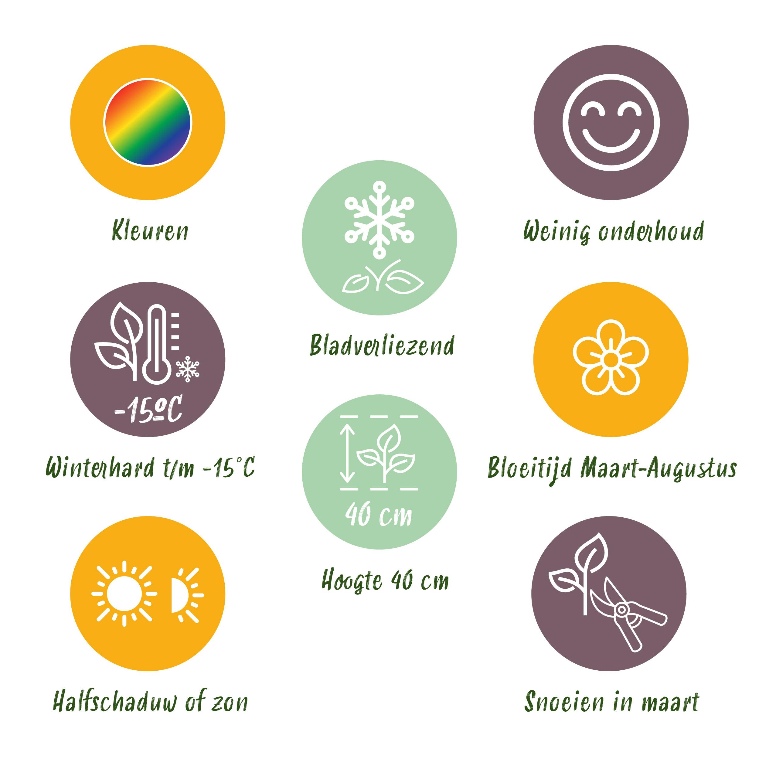 - Produit : Green boutiq – borderpakket – bodembedekkend – 8 vaste planten – 1 m2 – diversen kleuren – weinig onderhoud – pot 11cm