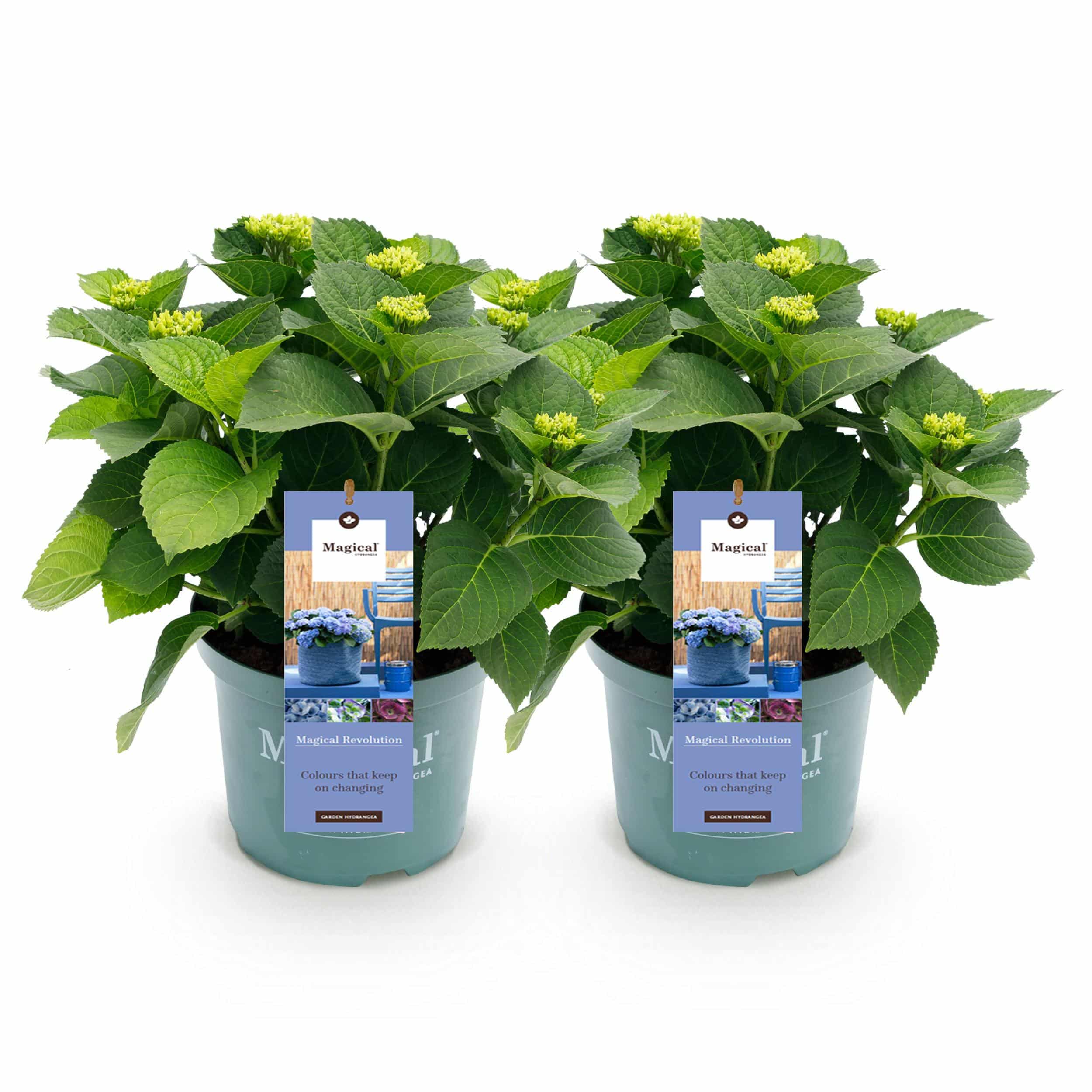 Green boutiQ – Plante de patio – Hortensia – Hydrangea Magical Revolution Blue – Bleu – 6-10 fleurs – 2 plantes – Pot 23cm Hauteur 55cm