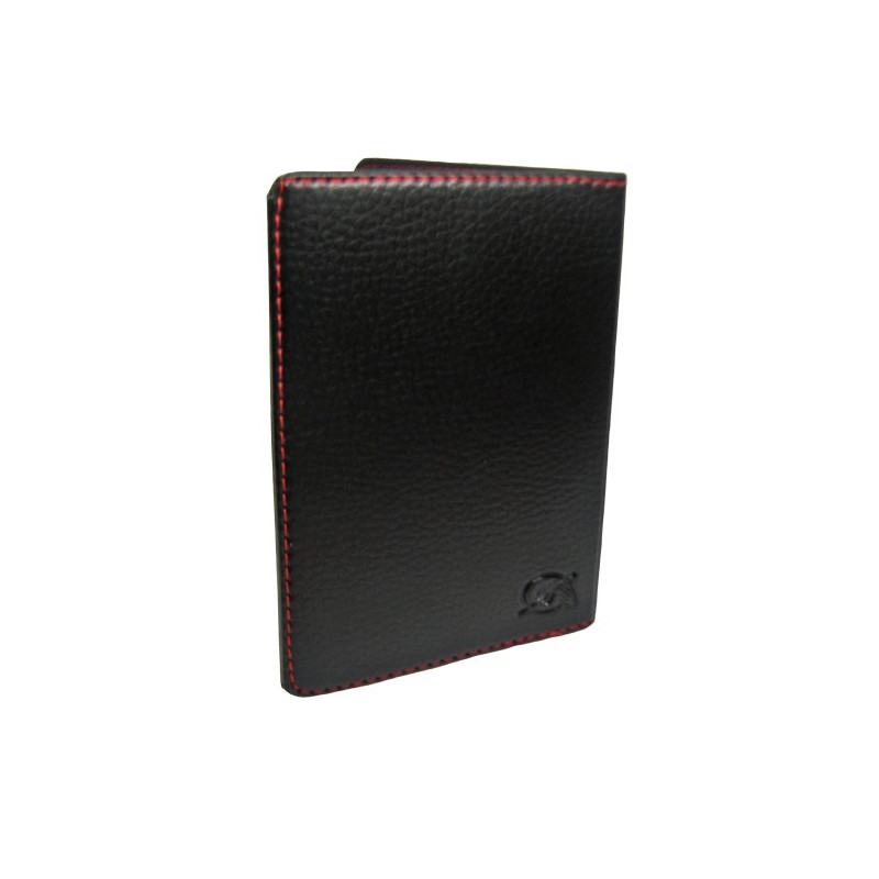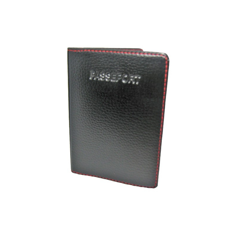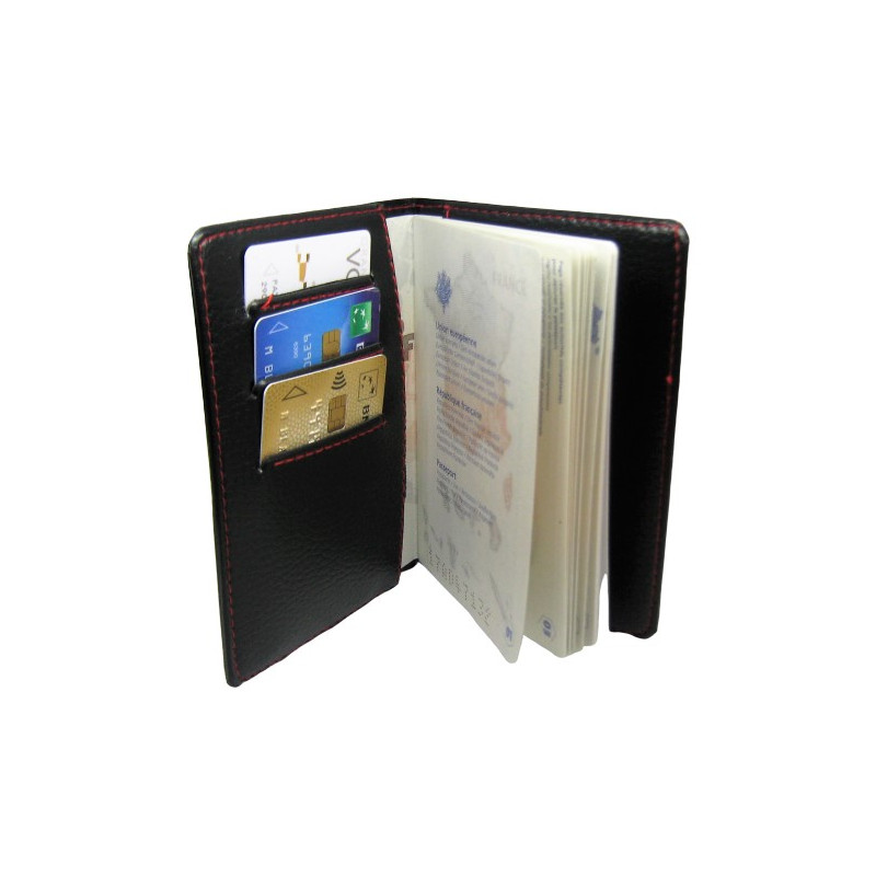 Protège passeport en cuir synthétique noir surpiqué rouge Format fermé : 110*135mm 3 emplacements pour CB à l’intérieur bénéficiant également de la fonction Barrière RFID