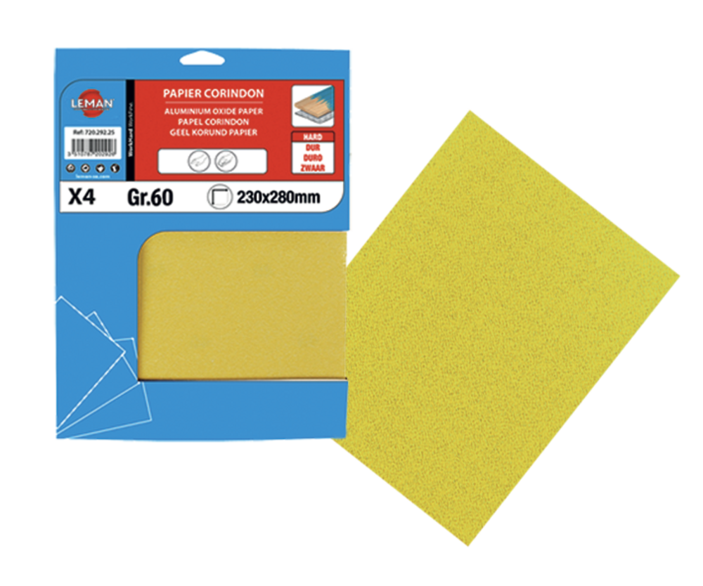 4 FEUILLES PAPIER CORINDON JAUNE 230X280 GR 40 Papier poids C (D pour les grains 40 et 60). Liant double résine.
