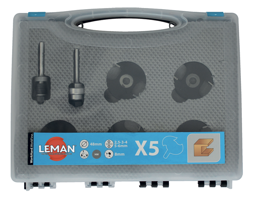 COFFRET 5 DISQUES A RAINER HM + 2 ARBRES Q8 POUR DEFONCEUSE Épaisseur disques : 2,5 / 3 / 4 / 5 / 6 mm. Arbres : Lt. 72 – Lu. 26 mm / Lt. 65 – Lu. 20 mm. Roulements : Ø 19 / Ø 22 mm. Bagues : 2 x 0,5 mm / 4 x 1 mm / 4 x 2 mm.