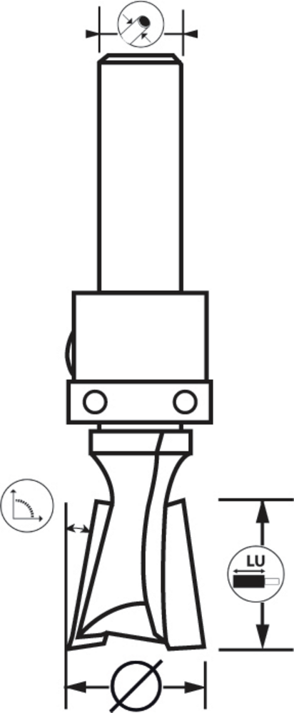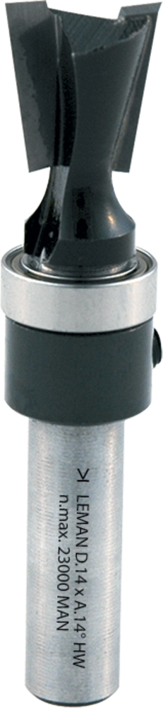MECHE QUEUE ARONDE D12,7 LU.12,7 8° Q8 +RLT SUP. HM Assemblage en queue d’aronde dans le bois en suivant un gabarit. Rechange : roulement (Ø 12,7) 890.002.10 – roulement (Ø 14) 890.002.13.