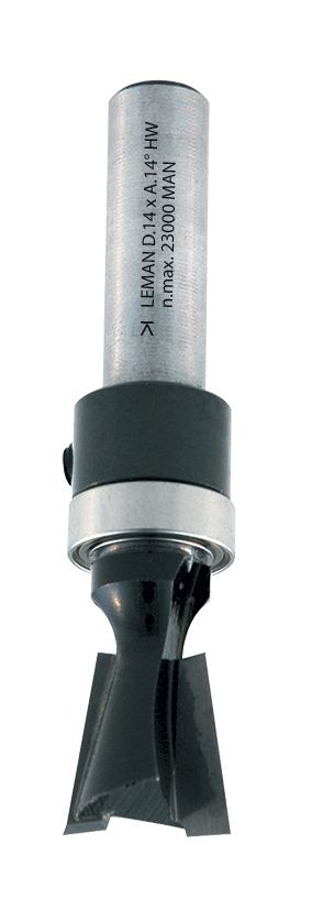 MECHE QUEUE ARONDE D14 LU.12,7 14° Q8 +RLT SUP HM Assemblage en queue d’aronde dans le bois en suivant un gabarit. Rechange : roulement (Ø 12,7) 890.002.10 – roulement (Ø 14) 890.002.13.