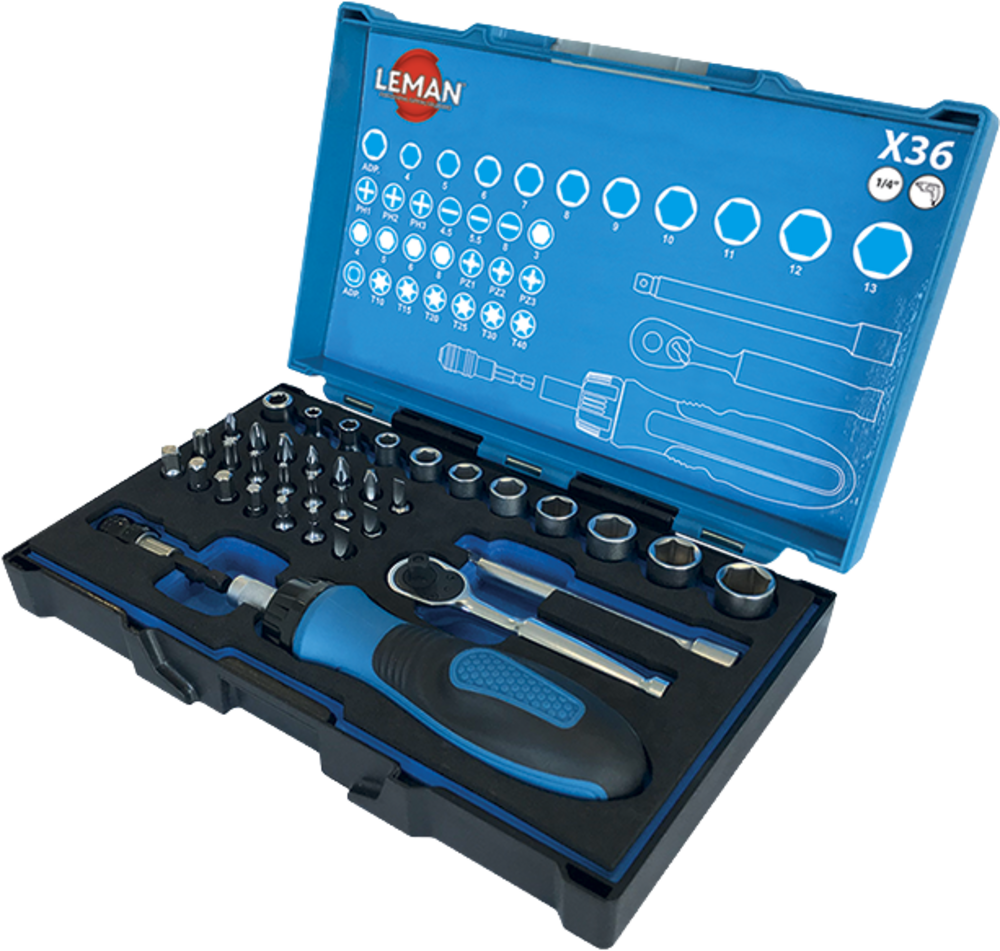 COFFRET DE DOUILLES 1/4 + EMBOUTS 36 PIECES – 57036 – LEMAN