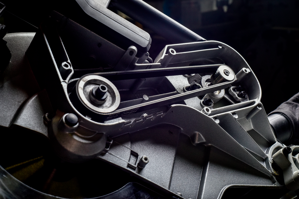 Socle en fonte d’aluminium moulé sous pression, percé pour pouvoir fixer la machine sur un établi.