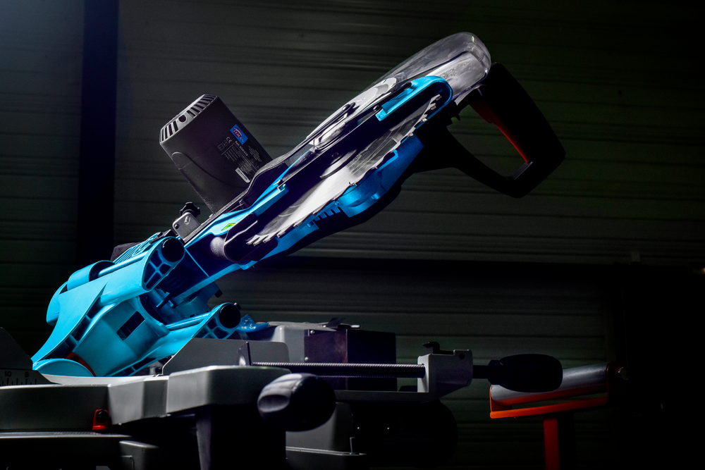 Table de sciage en fonte d’aluminium, orientable de 45° à droite et à gauche.