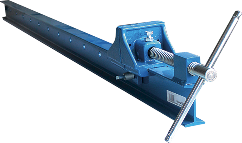 Piston de pression en une seule pièce, filetage grande puissance avec manche en croix, barre en acier IPN percée pour la fixation du sabot mobile, face d’appui en fonte.