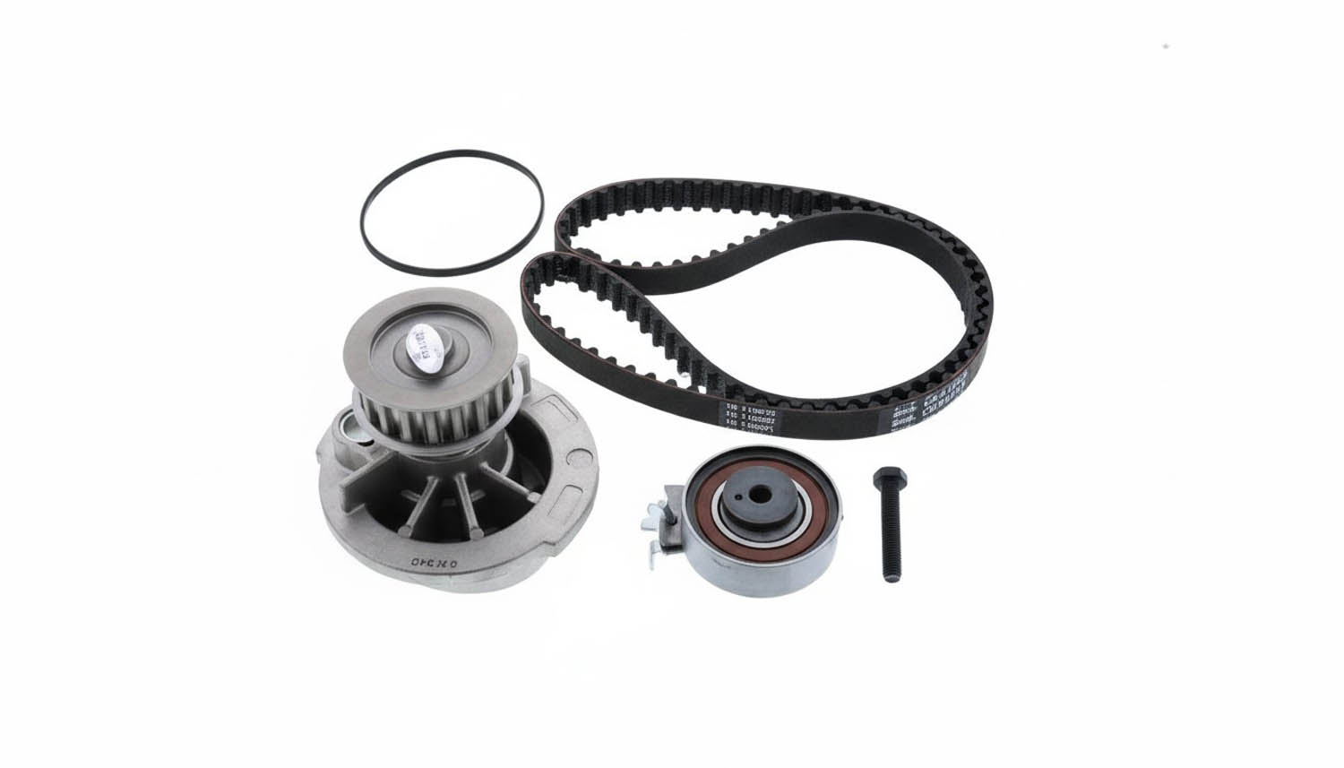 Kit complet avec courroie, galet tendeur et pompe à eau pour révision précise.